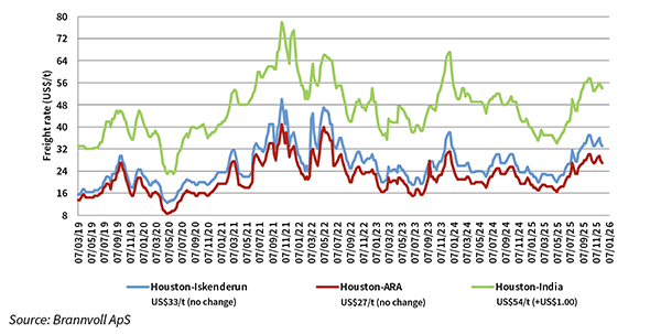 Freight rates for transportation of a Supramax-lot of petcoke from Houston to ARA ports with spot laycans are at US$27/t on average. Deals for delivery of 50,000t of petcoke from Houston to Iskenderun with spot laycans are discussed at around US$33/t on average. Shipping costs for delivery of a Supramax-lot of petcoke from USG to EC India are at US$53/t on average.