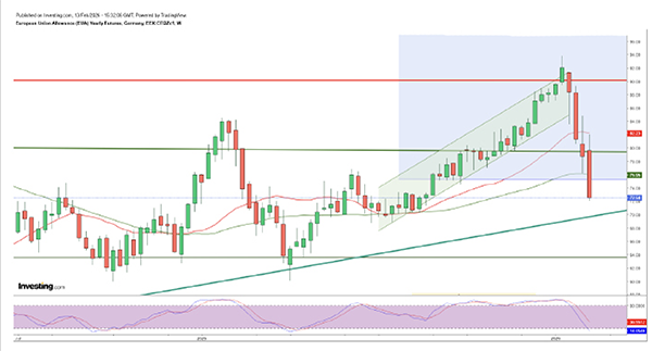 The Dec 2026 contract saw a sharp fall of 21 per cent to EUR71. It is most likely that EUR70 will act as a major support. The long-term EUA price for 2030 has fallen by EUR17 to EUR83. The market is not expected to reach the EUR100 mark until the 2033 contract. Meanwhile, the UK Allowance (UKA) December 2026 contract has fallen 30 per cent to GBP46.00 (EUR53).